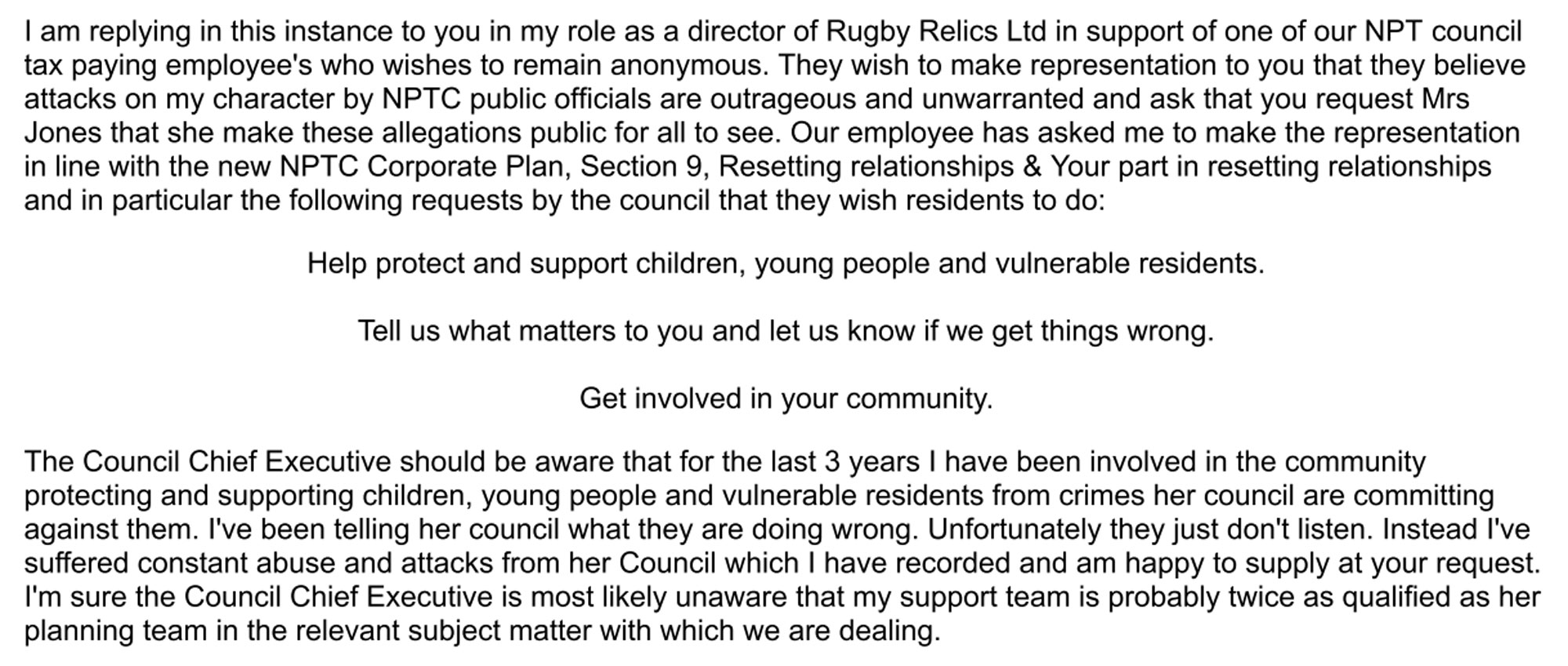 Our ref: 20230606A-EM-GRAC-CREE-report Distribution: Christina Rees, MP, Neath - christina.rees.mp@parliament.uk Karen Jones, Chief Executive NPTC - chief.executive@npt.gov.uk Jennifer Herbert, Monitoring Officer, Glynneath Residents Against Contamination - jenirobs@googlemail.com Dear Christina Rees (copied to Mrs Karen Jones with supplementary note) Thank you for forwarding the reply made to you by the NPTC Chief Executive. It would seem that both she and Councillor Knoyle wish to discredit me, but without actually providing you with evidence that I have committed a crime or any such act that requires this defamation of character. I would suggest that in our previous contacts you are aware of the quality of my work and that my analysis and representation of factual evidence as in previous cases, is spot on. I have been publicly discredited by Neath Port Talbot Council public officials since I stood up for the rights of around 30 elderly residents whom I supported because NPTC refused them the right to communicate through their regular channels during the COVID pandemic. They wanted to live in safety and object against a housing development, during the pandemic, however, the only option offered to them was to send an email to the council to raise objections. I then got blocked for sending too many emails in support of residents who didn't have access to email. I am of course aware that these discreditations are words that have no substance and as such they do not cause the same havoc to one's brain as does the toxic waste we are living next to. I have passed the Chief Executive's response on to the Glynneath Residents Against Contamination monitoring officer, Jennifer Herbert who I'm sure will be in touch with you. I am replying in this instance to you in my role as a director of Rugby Relics Ltd in support of one of our NPT council tax paying employee's who wishes to remain anonymous. They wish to make representation to you that they believe attacks on my character by NPTC public officials are outrageous and unwarranted and ask that you request Mrs Jones that she make these allegations public for all to see. Our employee has asked me to make the representation in line with the new NPTC Corporate Plan, Section 9, Resetting relationships & Your part in resetting relationships and in particular the following requests by the council that they wish residents to do: