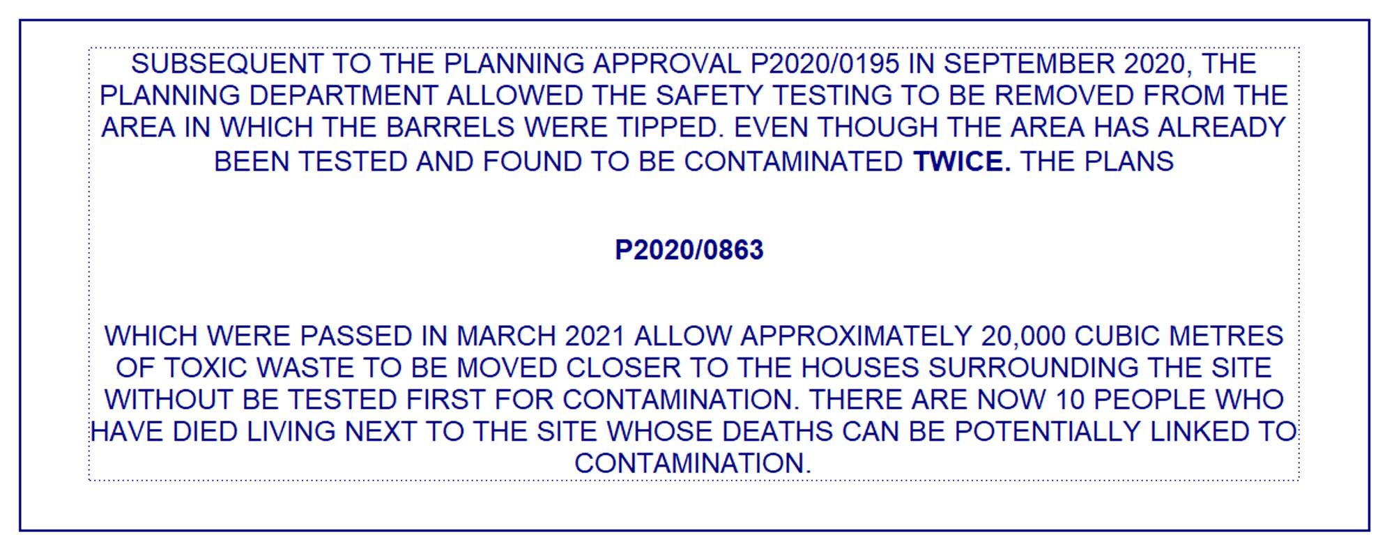 TO NEATH PORT TALBOT PLANNING COMMITTEE This is the third interview with Brynhyfryd resident Nigel Taylor about the barrels he witnessed being brought onto the Heol y Glyn landfill site circa 2010-2012. The first interview took place in March 2020 and the information was provided to the Glynneath Councillors Del Morgan and Simon Knoyle in April 2020, to Natural Resources Wales and the Contaminated Land Officer in July 2020. It was presented to the Planning Committee in the agenda document in September 2020. It is October 2023 and the land has still not been checked for the barrels. Natural Resources Wales say it is too expensive and Neath Port Talbot Council have approved plans for the developer to move the land closer to peoples houses or off the site without any chemical contamination testing taking place. At least 10 people have now died living close to the site whose deaths can potentially be linked to land contamination. Chris Williams is the current Mayor of Neath-Port Talbot and was a member of the Planning Committee that approved the Enzo Homes plans to build on the site in September 2020. Community opinion is that his wife Sian died of un-natural causes, believed to be from complications during an operation at hospital. this may have followed neurodegenerative episode. It is believed that she died soon after Nigel told them about the dump. Poisons were identified at the site in 2008 and Neath port Talbot Council worked with the Cuddy Group to avoid regulation testing on the site. Chris Williams moved out of the area shortly after that, he refused to provide information about his wife's death after being told we were investigating the health of residents surrounding the site. This was shortly before the Planning Committee meeting. He was provided information about the 2008 contamination before the Planning Committee meeting which breaks councillor guidelines. THIS IS PREJUDICIAL INTEREST He should have declared that he had prejudicial interest in the site and he should have stepped down from the meeting. He did not. SUBSEQUENT TO THE PLANNING APPROVAL THE PLANNING DEPARTMENT ALLOWED THE SAFETY TESTING TO BE REMOVED FROM THE AREA IN WHICH THE BARRELS WERE TIPPED P2020/0863 THIS ALLOWS APPROXIMATELY 20,000 CUBIC METRES TO BE MOVED CLOSER TO THE HOUSES SURROUNDING THE SITE. |