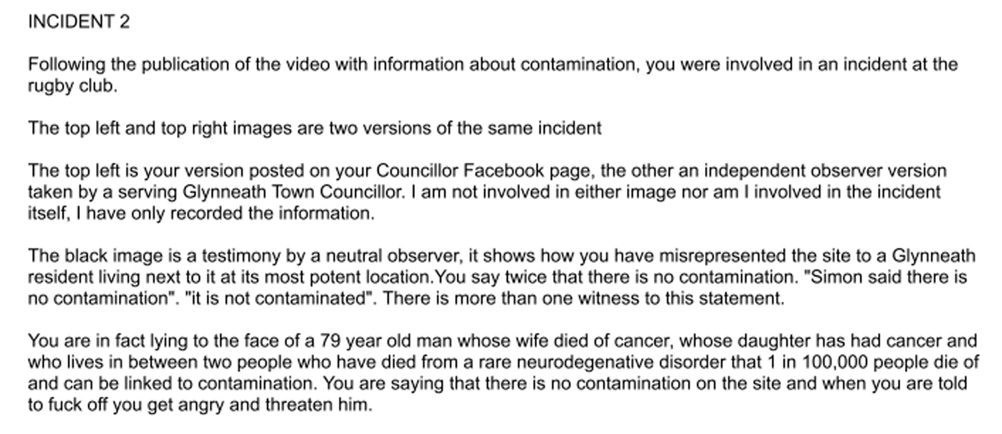 Mr Richards has asked that “Christina please make representation on our behalf of our group Glynneath Residents Against Contamination to the Council Leader at NPTC, Stephen Karl Hunt, requesting an official response from the council in relation to a document submitted to 15 NPTC Councillors in September 2020 that identified the council breached the UK Government's 1990 Environmental Act during the planning process at the Heol y Glyn site. To date this document has not been responded to and there is clear evidence that the Head of Planning at NPTC, Ceri Morris has misrepresented this UK Government legislation.”