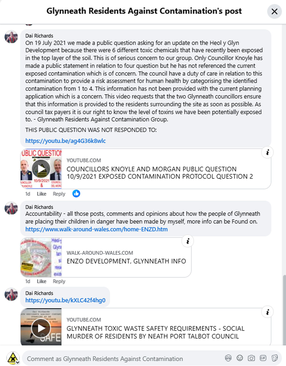 On 19 July 2021 we made a public question asking for an update on the Heol y Glyn Development because there were 6 different toxic chemicals that have recently been exposed in the top layer of the soil. This is of serious concern to our group. Only Councillor Knoyle has made a public statement in relation to four question but he has not referenced the current exposed contamination which is of concern. The council have a duty of care in relation to this contamination to provide a risk assessment for human health by categorising the identified contamination from 1 to 4. This information has not been provided with the current planning application which is a concern. This video requests that the two Glynneath councillors ensure that this information is provided to the residents surrounding the site as soon as possible. As council tax payers it is our right to know the level of toxins we have been potentially exposed to. - Glynneath Residents Against Contamination Group. THIS PUBLIC QUESTION WAS NOT RESPONDED TO: |
