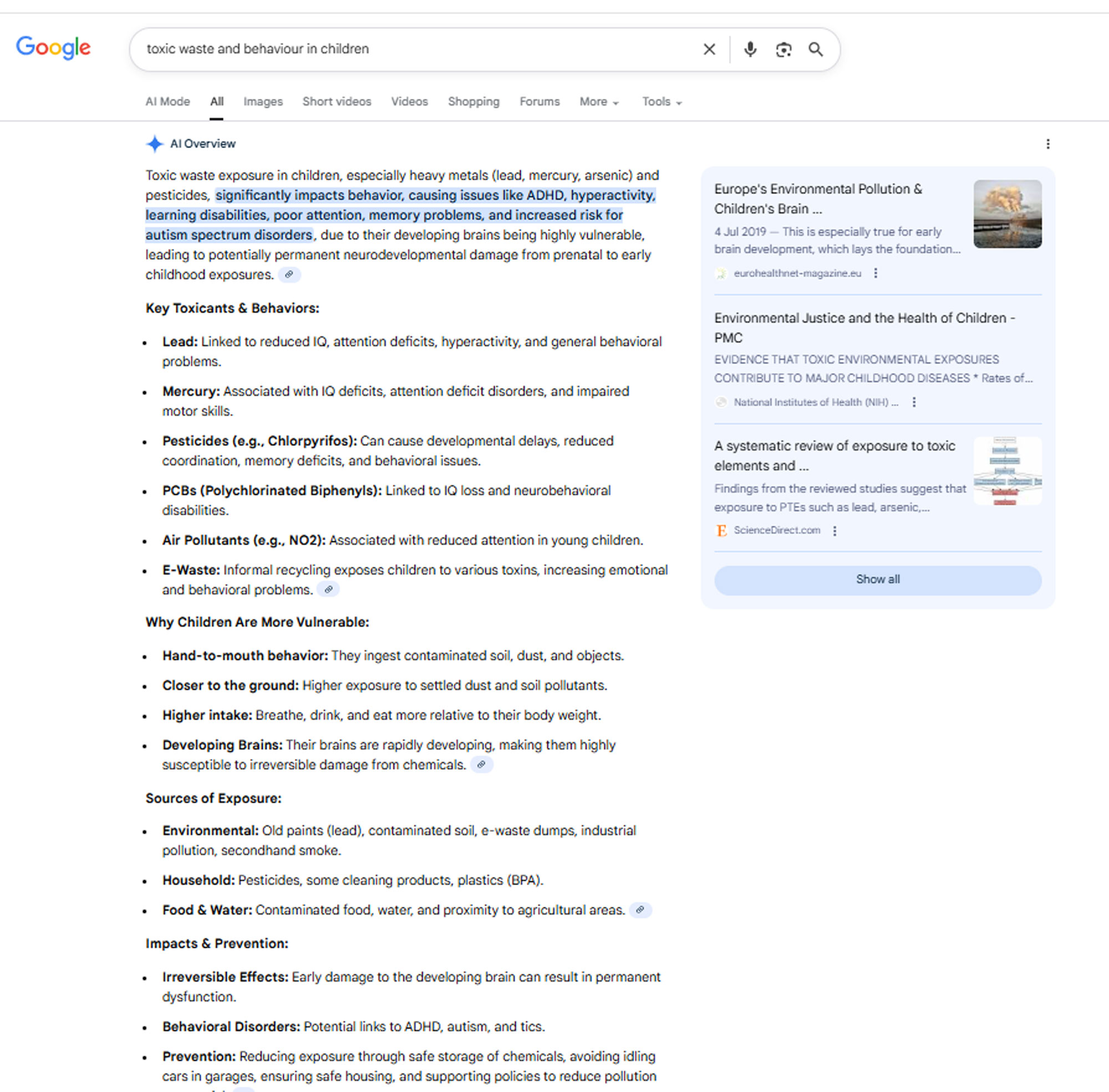Toxic waste exposure in children, especially heavy metals (lead, mercury, arsenic) and pesticides, significantly impacts behavior, causing issues like ADHD, hyperactivity, learning disabilities, poor attention, memory problems, and increased risk for autism spectrum disorders, due to their developing brains being highly vulnerable, leading to potentially permanent neurodevelopmental damage from prenatal to early childhood exposures. Why Children Are More Vulnerable: Developing Brains: Their brains are rapidly developing, making them highly susceptible to irreversible damage from chemicals. Household: Pesticides, some cleaning products, plastics (BPA). Food & Water: Contaminated food, water, and proximity to agricultural areas. Impacts & Prevention: |