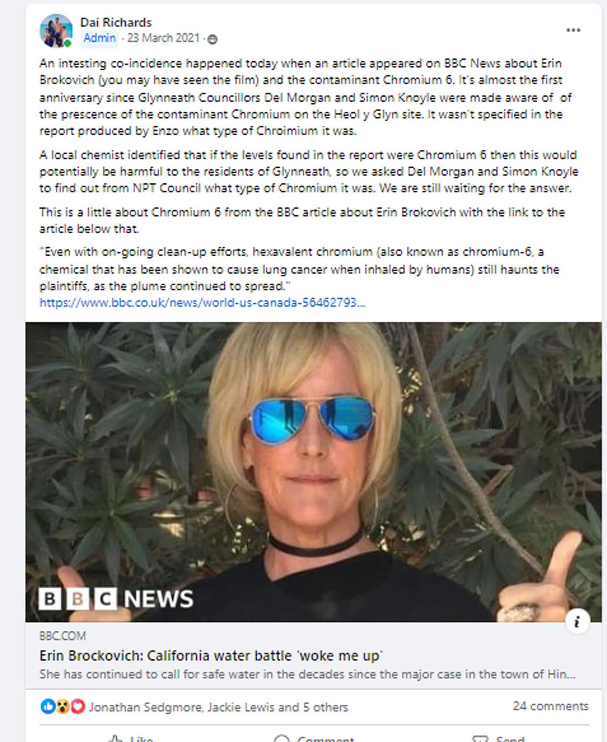 | 20260313R-WBFB-brokovich-pub | Glynneath News and Views Facebook group post - Erin Brokovich & Chromium - Knoyle and Morgan refused to provided further info on Chromium test results. |