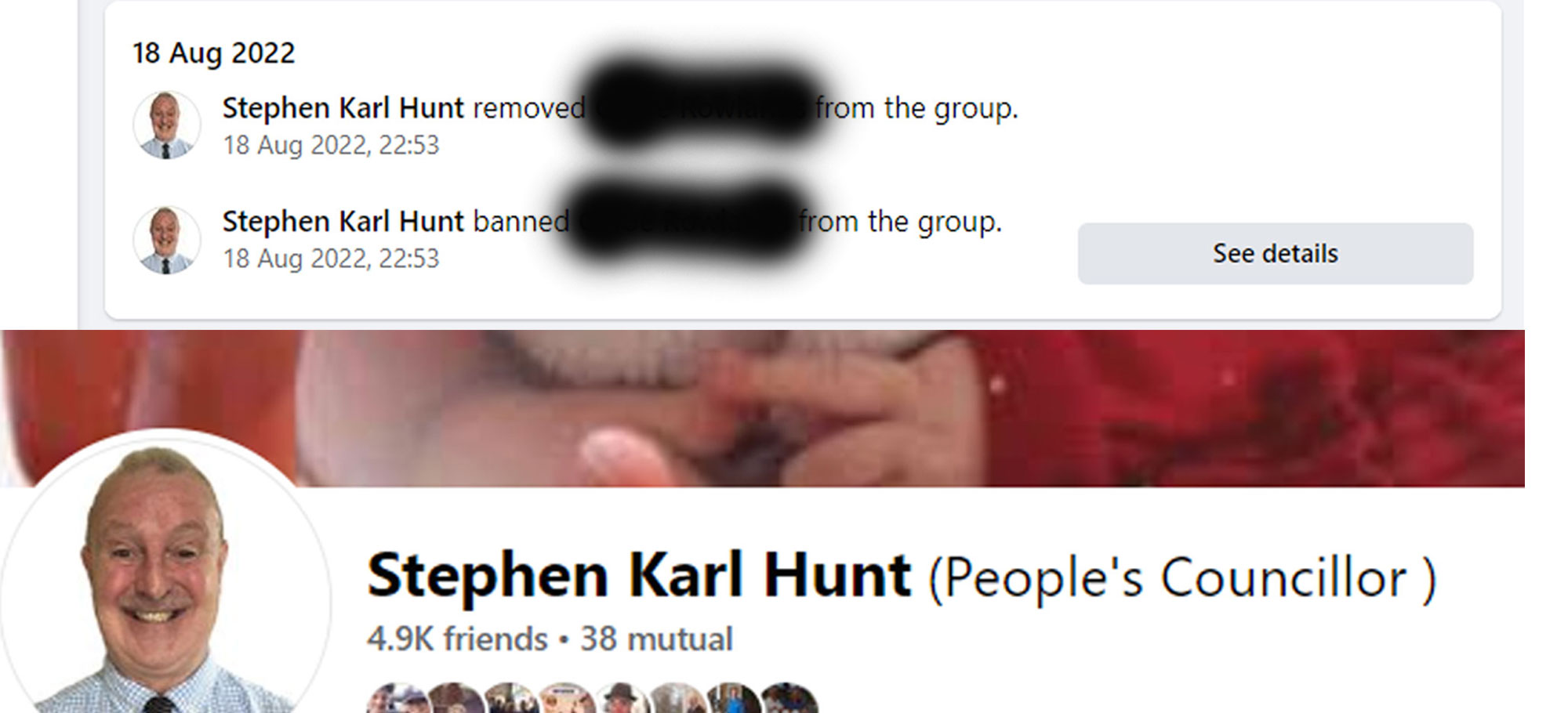 The former group admin Stephen Karl Hunt has been removed from the group because of concerns that his activity whilst being an admin in the group fail to meet his requirements as a public figure and that his actions contravene the Nolan Principles by which public officials should adhere. The top of this image is one such example. Stephen Karl Hunt has blocked me and also refuses to communicate with me by other means such as email. Friends of Stephen Karl Hunt within the group are welcome to invite him to re-join the group so that he can explain his actions. He will of course need to unblock me first and once he has done so, I will let him re-join.
