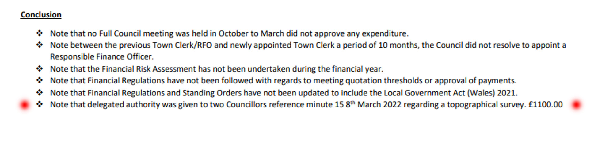 | 3/11/22 | Clerk Account <clerk@glynneathtowncouncil.gov.uk> 3 November 2022 at 17:20 To: Dai Richards <dairichardswales@gmail.com> Dear Mr Richards, Thank you for your email and your patience in awaiting my reply. I have just picked up this message and taken a cursory look over the contents but will be investigating this further in the morning. I would be happy to cooperate with the WAO and auditors on this matter and thank you for bringing it to my attention with the further resources that you have provided. I know that Audit Wales has started looking through some of our paperwork today as I have received a follow-up question but I am afraid I can't say how long it would be for anything more in-depth. As stated though, I would be interested in investigating this further in the coming working days, especially in the name of transparency for all parties concerned. I can say that the topographical survey wasn't undertaken at the time of the first agenda item and that I subsequently sought quotes and guidance in the past few months so this would not show in the previous financial year either as a payment or a source of quotations but that doesn't mean that the method should and is still rightly, through our internal and external auditors, questioned and scrutinised. Thank you again and I will take a closer look at this item and seek some further guidance in the coming days. All the best, Ceri - Ceri Willcox (Mx) - Clerc y Cyngor / Clerk to the Council |