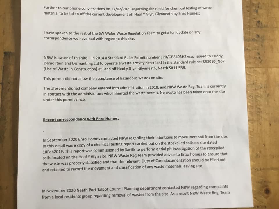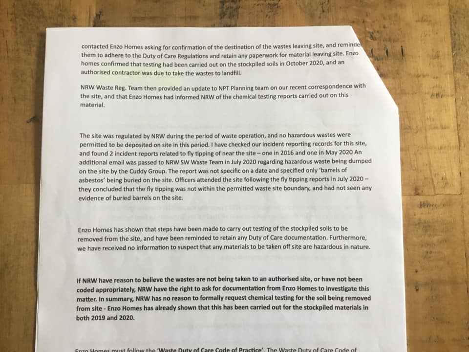 "had not seen any evidence of buried barrels on the site" - Cuddy had been in administration for 2 years at this point and the evidence provided to NRW indicated that the barrels had been buried underground. "November 2020" - NPT planning say that the residents group reported to them about Enzo. This is fabricated information. NPT had refused all communication with us so we reported the info to Powys CC who then reported to NPT. |
