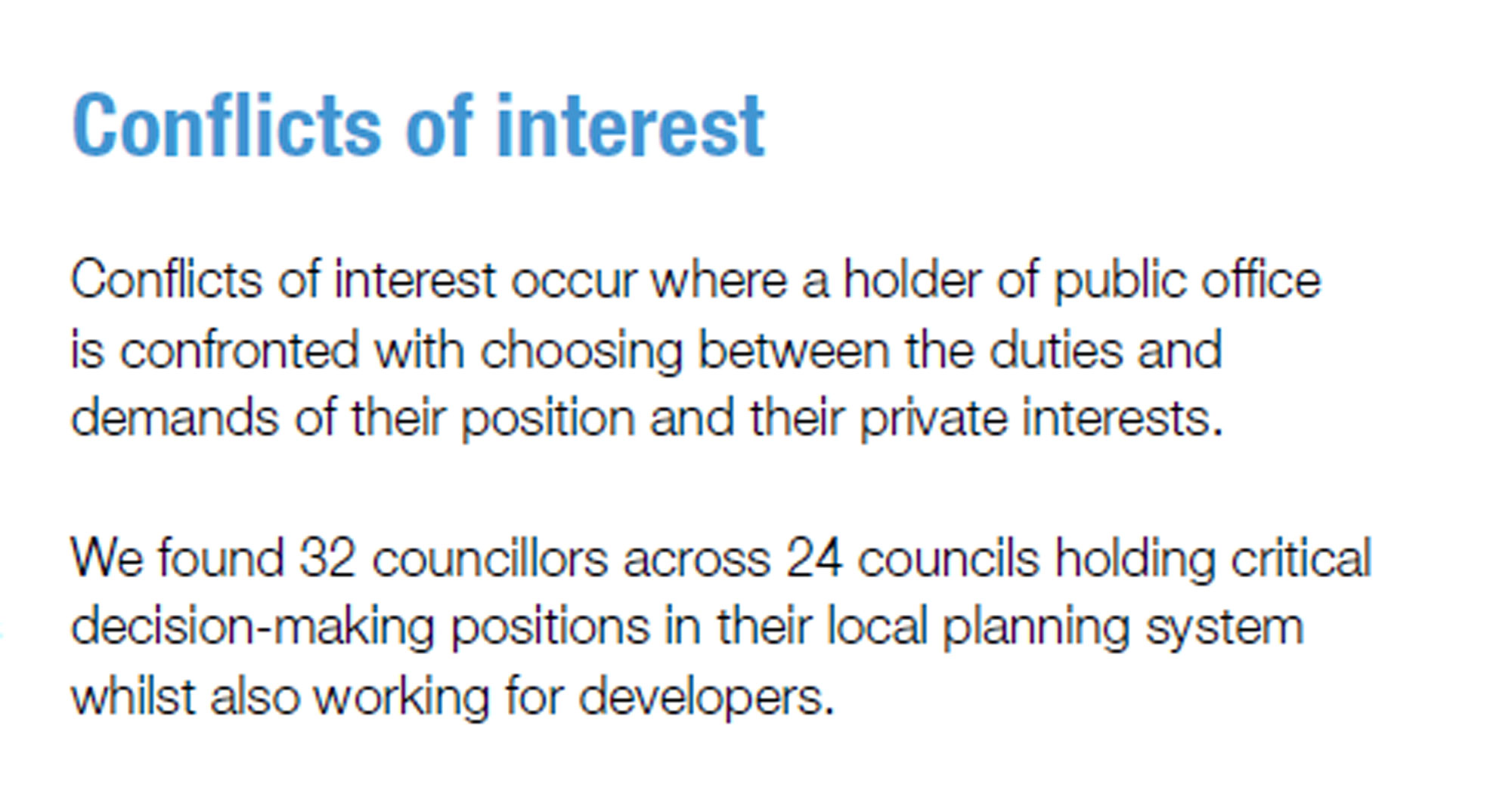 Conflicts of interest occur where a holder of public office is confronted with choosing between the duties and demands of their position and their private interests. We found 32 councillors across 24 councils holding critical decision-making positions in their local planning system whilst also working for developers. |