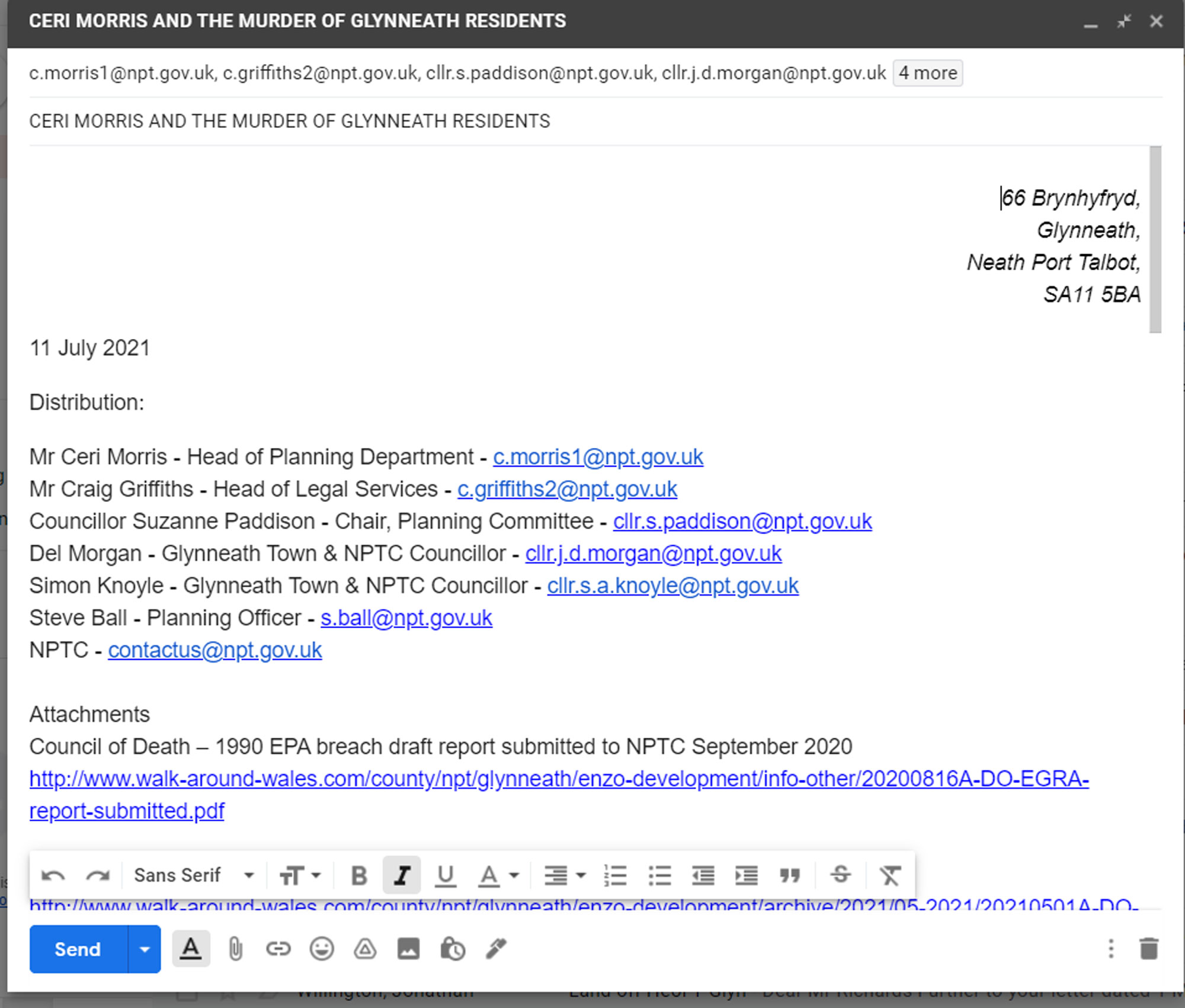 4 July 2021 Distribution: Dear Neath-Port Talbot Council Public Officials Our ref: 20210704A-EM-RICD-NPTC-morris.video We have just uploaded a video to youtube for public viewing that reaches the following conclusion: Ceri Morris is continuing to and has potentially murdered Glynneath residents to support the corrupt activities of the Neath-Port Talbot Council Planning Department. This email is sent to you so that you have the opportunity to provide counter evidence to that presented in the video or to undertake an investigation into this allegation. The video is uploaded in response to the NPTC value "We will be open to challenge and will promote a culture of learning and innovation throughout our organisation" as stated in the NPTC Corporate Plan. The video also draws its inspiration from the remaining 'purpose, vision and values of the Neath-Port Talbot County Borough Council which are: Our Purpose: Neath Port Talbot Council exists to serve and represent the interests of its citizens and communities. We strive to improve the economic, social, environmental and cultural well-being of all of our people. Our Vision: We want our county borough to be a place where everyone has an equal chance to get on in life – a place where people want to live, learn and work and bring up their family. We want our beautiful natural environment, and our rich cultural and industrial heritage to be appreciated and protected for many future generations to enjoy. We also want to pursue new and existing opportunities for economic growth so we can sustain our diverse communities for many years to come. Our Values: We will stand up for our citizens and our communities, advocating for the needs and aspirations of our people in every aspect of our work. We will listen to our citizens, our workforce and our many partners and seek ways to meaningfully involve people in our work. We will celebrate diversity in all of its forms and work tirelessly for greater equality in all of our communities. We will conduct the work of the Council in an open and accessible way, ensuring we are properly accountable for the decisions we make. We will make the best use of all resources available to us. We will further strengthen the bonds of collaboration, working with others – including the voluntary, statutory and private sectors to benefit our citizens and communities. I trust this email finds you well, I look forward to your response in due course. regards - David Richards