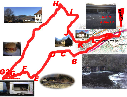 THE WALK START - Glynneath Town Centre Car Park - Take path under road bridge and follow the river to the end of the path looking left you will see the subway under the road to Cwmgwrach, looking right you will see a road.............. B - Turn right and follow this road. - PHOTO CLICK HERE C - At the end of this road turn right and then immediately left onto the old Resolven road B4242. Follow this road for about 400 metres and on your left there will be a tarmac path leading off to the left. D - Turn left here and rejoin the river path where it leaves the road. Follow this path and at the point it turns from tarmac to gravel, turn right. As soon as you arrive at an open grassy space just before the canal bridge if you immediately turn right and follow the tree line for about 10 metres just before you hit the canal path there is a massive lime kiln that is worth a look. E - At the point where this path meets the canal, cross bridge onto a lane. - PHOTO CLICK HERE F - at the end of the lane when you reach the B4242 again turn left and proceed along the grass verge. MMMMMMMM - Marshalls is about 200 metres on the same side. There is no pavement here but a generous verge that you can walk on. Marshalls is normally open until about 2.00pm. To pre-order your Marshall's meal please ring 07974 602 681. G - Continue past the Marshall's layby and almost directly opposite the end cross the road and walk up the forestry track G2 - After about 400 metres turn right onto a forestry track. The track immediately forks, take the left more prominent fork. Continue along this track, it will come to a wide forestry well used forestry road that - continue across this road and follow the track to point H. It is from this point onwards that you will note tyre tracks and rutted areas, This area is used for Motorsport, in particular motorbike scramblers and rally cars and this is where you will get muddy. H - On reaching the path/bridleway junction turn right down the hill, there should be a stream with cascades on your right, The path continues through a gate next to the stream. I - At the stream junction, leave the stream and continue down the concrete road which which lead you back into civilization. Continue straight on and when the road turns left fork right towards the church. J - Head down the lane to St Cadoc's church. At the end of the lane you pass through the gates of the old Aberpergwm House. - PHOTO CLICK HERE K Turn left at the road. Cross over the road at some stage then just after the Lamb & Flag and before the speed camera look for a grassy path that goes off at a 2 o clock angle on the right. - PHOTO CLICK HERE L -Take this path and within about 100 metres you should arrive at the 'road to nowhere'. this is the old bypass that is now closed off at either end. Walk the length of the road and just before the end on the right hand side......... M - ..... cut back down a wide rough path and this will take you back down to the river path, follow the river path back to the finish. |