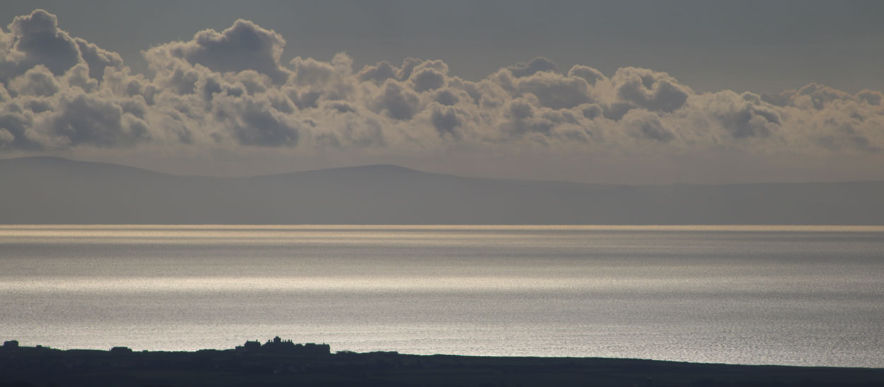 View from the Ogwr Ridgeway walk with the Porthcawl Golf Club (I believe) in the foreground and the North Somerset coast in the distance. The clouds are on the English side of the border, there are no clouds in Wales