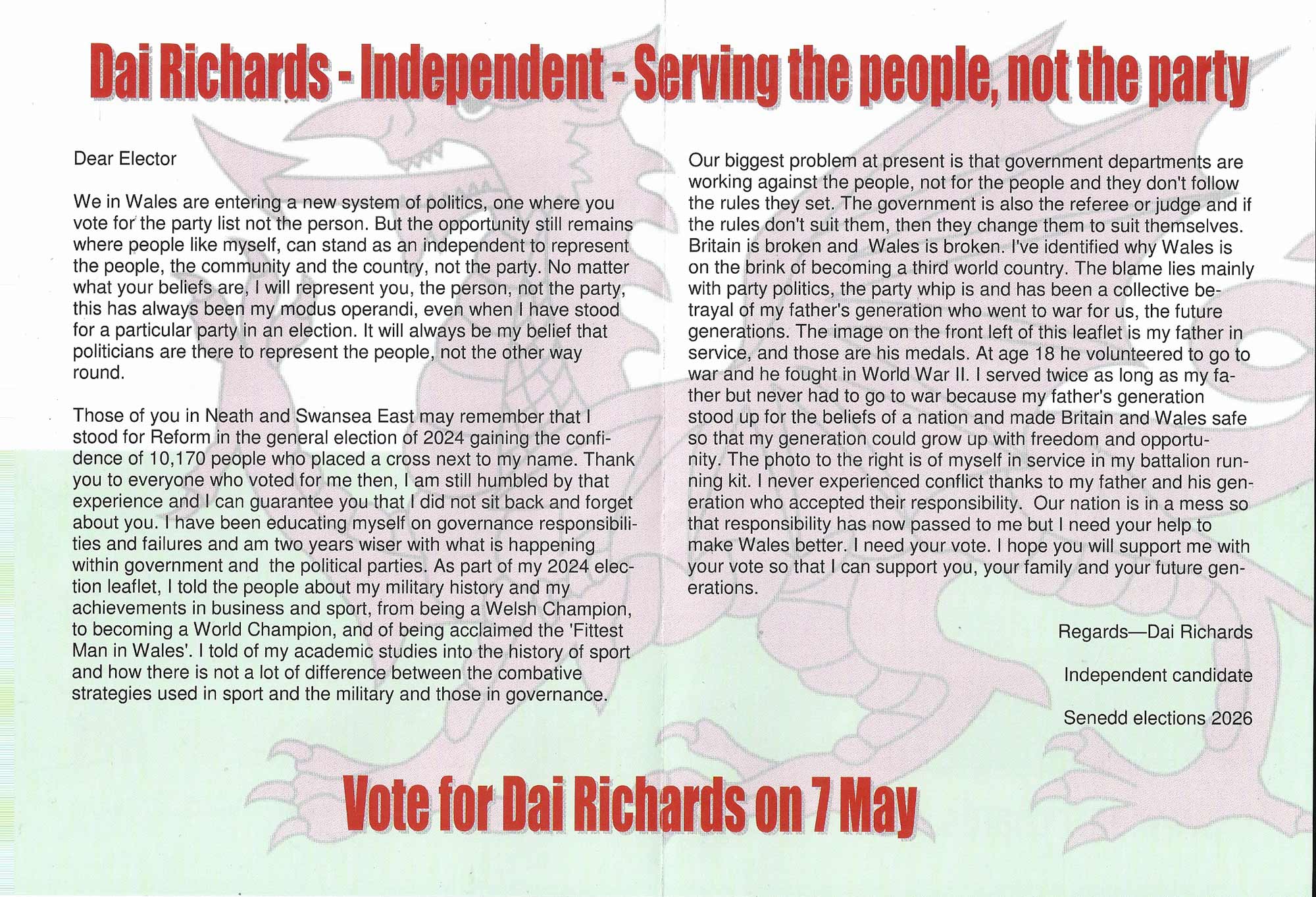 2026 SENEDD ELECTION - BRYCHEINIOG TAWE NEDD CANDIDATE INFORMATION DAI RICHARDS INDEPENDENT |